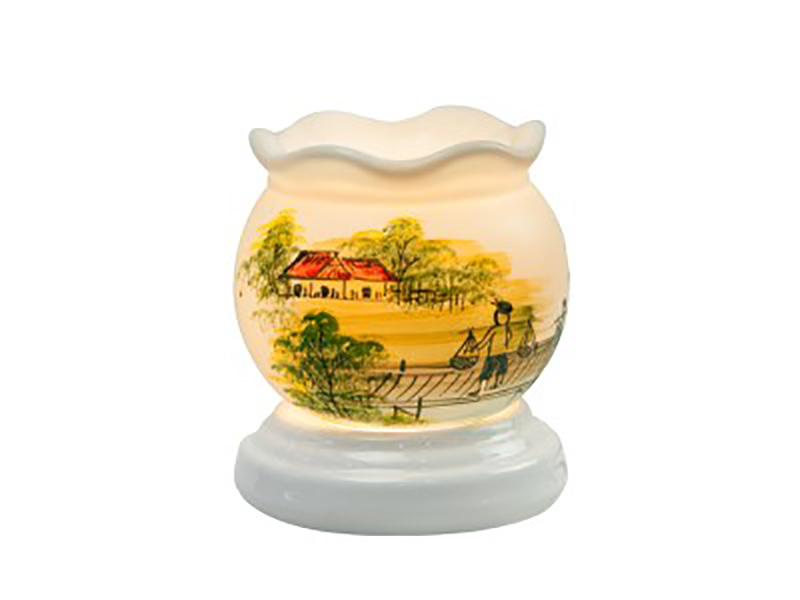 Đèn xông tinh dầu Bát Tràng vẽ phong cảnh làng quê là một trong nhiều sản phẩm tiêu biểu với bức ảnh xây dựng nổi trội, hấp dẫn trên nền men sứ trắng ngà ấm cúng. đem đến hiệu ứng mỹ thuật giúp trang trí nơi ăn chốn ở trong nhà thêm trang nhã.